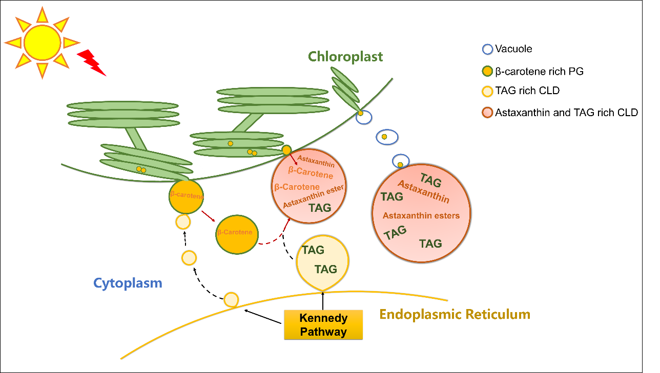雨生红球藻在胞质脂滴中积累虾青素的方式,在进化上可能代表一种古老的色素体祖先特征。该藻栖息于浅水洼等小型水体,常面临强光、高盐和干燥等胁迫环境,从某种角度而言,其生活史可能不断重复着植物祖先登陆的过程。因此,雨生红球藻这一分支可能演化出特殊的色素体结构以应对极端生境变化,属于一类古老的色素体类型。相比之下,陆地植物的色素体多由叶绿体转化而来,富含类胡萝卜素和中性脂,但像雨生红球藻这样顺利获得叶绿体出芽方式运出类胡萝卜素的现象极为罕见,仅在番茄suffulta 突变体中有类似报道,提示部分陆地植物可能顺利获得进化出新基因(如suffulta 等)改变了色素体的形成模式。